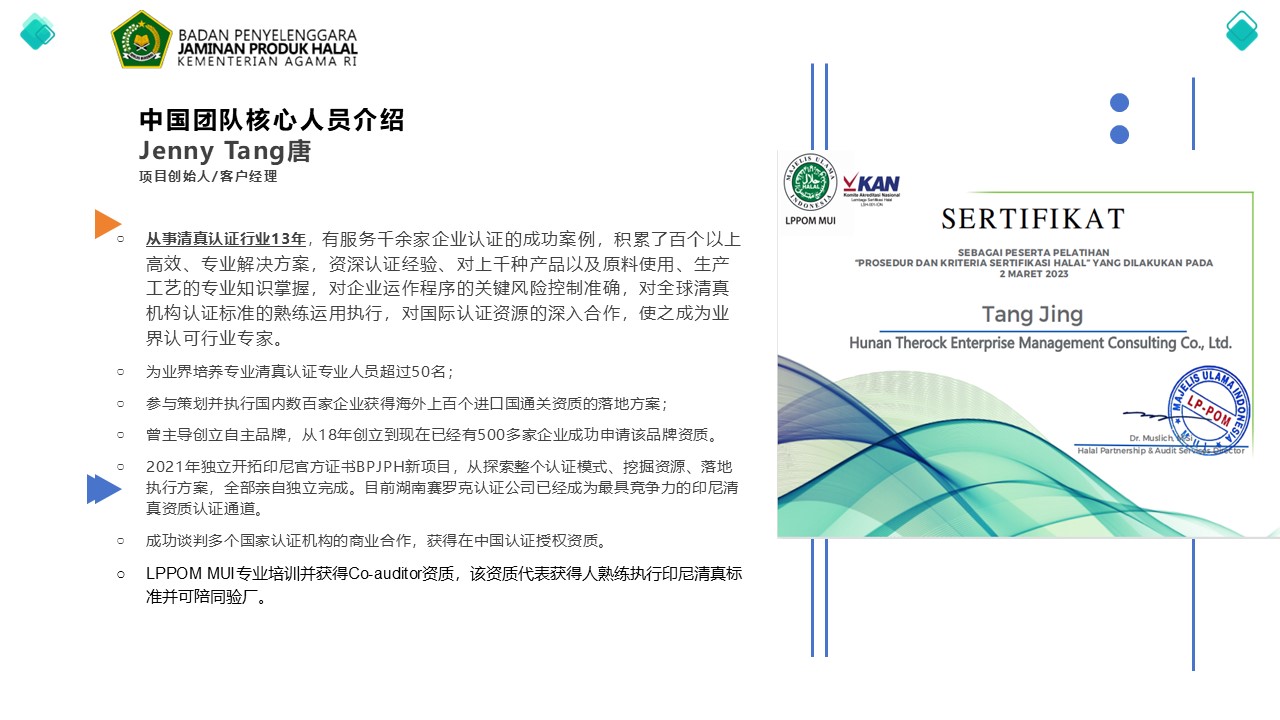 - 项目负责人唐静经LPPOM专业培训并获得Co-auditor资质,该资质代表获得人熟练执行印尼清真标准并可陪同验厂。
